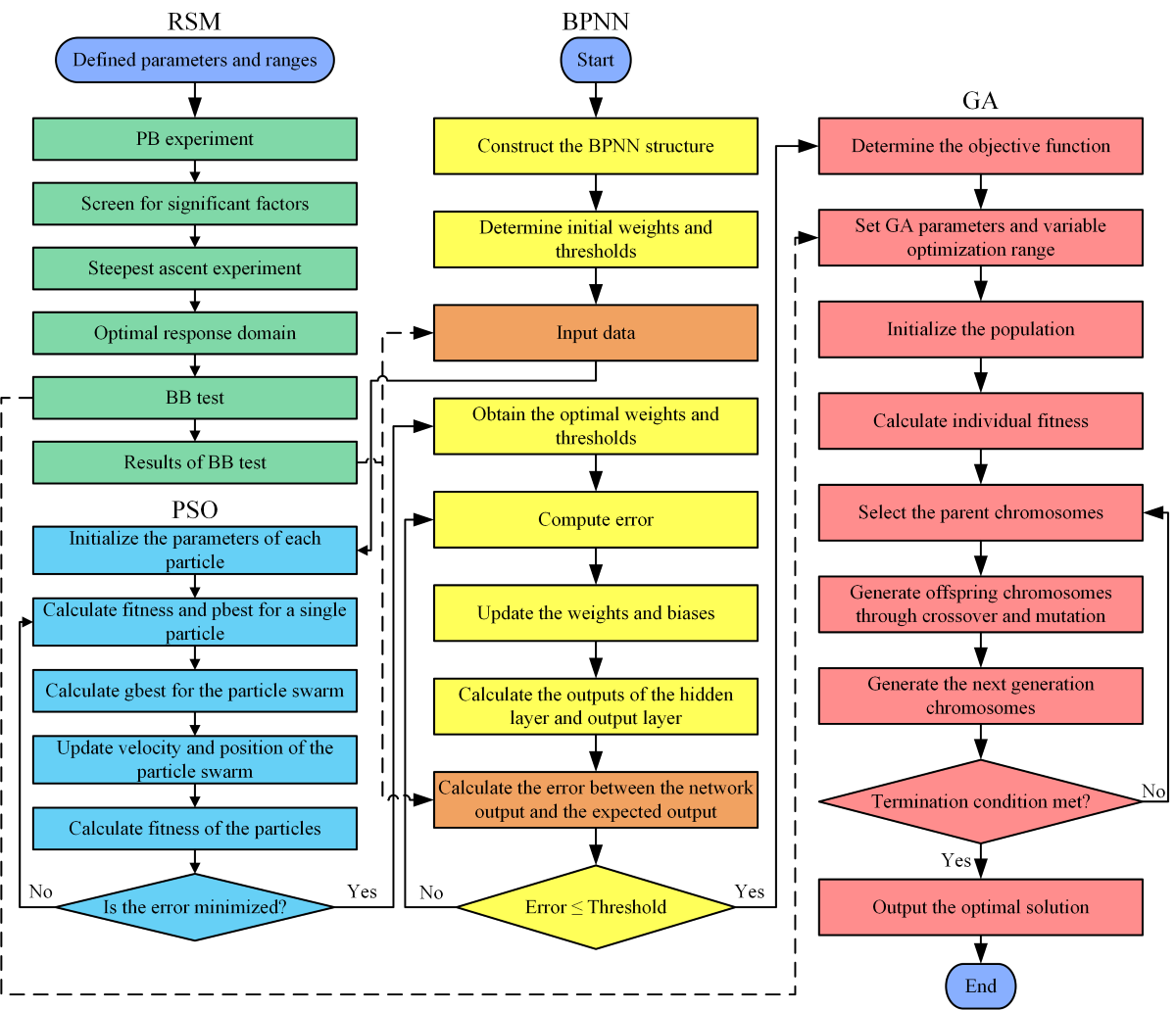 When the optimization parameters and their feasible ranges are undetermined, traditional methods such as analysis of variance (ANOVA) [7] and stepwise regression [8] often suffer from low efficiency, and a high risk of misjudgment or omission when dealing with multi-dimensional parameters and complex models. To avoid these limitations, a combined experimental strategy incorporating the Plackett-Burman (PB) experiment and the steepest ascent experiment [9-12] can be adopted. This approach can rapidly identify the most influential parameters on the experiment and their corresponding value ranges. Furthermore, response surface analysis using the Box-Behnken (BB) test can further determine the optimal parameter combinations [13-15]. The results of these combinations can be utilized as input and training data in the process of solving the objective function.