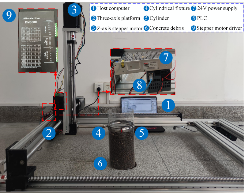 In this paper, the parameters between wet concrete particles were calibrated using a piling (angle of repose) test. The test device is shown in Fig. 2. The test apparatus consisted of a transparent cylindrical container made of organic glass, with diameter of 150 mm, and height of 300 mm. First, the cylinder was placed vertically on a horizontal plane and connected to a three-axis platform using a dedicated fixture to ensure alignment and stability. Then, a certain mass of wet concrete particles was filled into the cylinder. Finally, the Z-axis motor was activated to lift the cylinder at a constant speed of 300 mm/min. As the cylinder was raised, the wet concrete particles discharged freely from the bottom opening and formed a pile on the horizontal plane. When the particles stopped moving, photos of the formed particle pile were taken. The image acquisition system used an NPX-GS6500UM high-speed camera with a maximum resolution of 640×480.