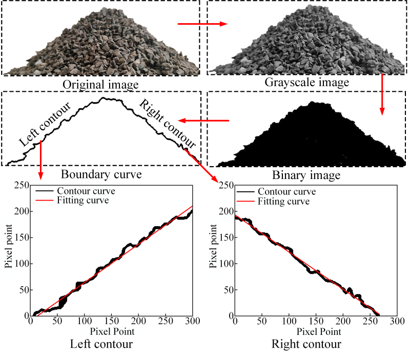 MATLAB software was used to perform grayscale conversion and binarization of the particle pile images, extract the contour of the particle pile profile, and fit them to calculate the magnitude of the tangent value, thereby obtaining the contour inclination (repose) angle of the particle pile. Each group of experiments was repeated five times, obtaining a total of ten datasets. The measured repose angles and corresponding error analysis are summarized in Table 1. The coefficient of variation was calculated to be 3.23 %, which is less than 5 %, proving the measurement method as a reliable one. The final repose angle of the wet concrete particle pile was determined to be 32.07°. The contour extraction process is shown in Fig. 3.