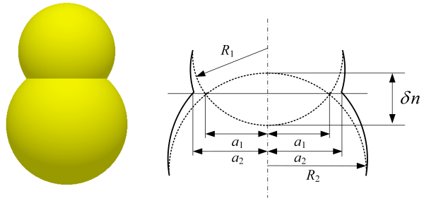 Due to the influence of surface energy, the contact radius between two particles expands from a1 to a2. The work of adhesion W, a key parameter, governing the adhesive force between different concrete particles, can be expressed as: