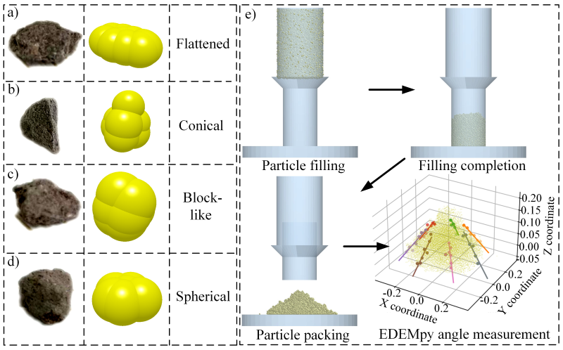 After completing the accumulation simulation in EDEM, to repose angle was accurately determined using EDEMpy interface. The three-dimensional coordinates of all stationary particles were directly extracted, and the three-dimensional surface topography of the particle pile was reconstructed. Contour lines were then derived from the fitted surface, to calculate its inclination angle as the simulated repose angle. This method calculates the repose angle directly from the particle spatial data, thereby avoiding potential errors introduced by secondary image processing. Each group of simulation tests was repeated three times. The accumulation process obtained from the simulation is shown in Fig. 5e.