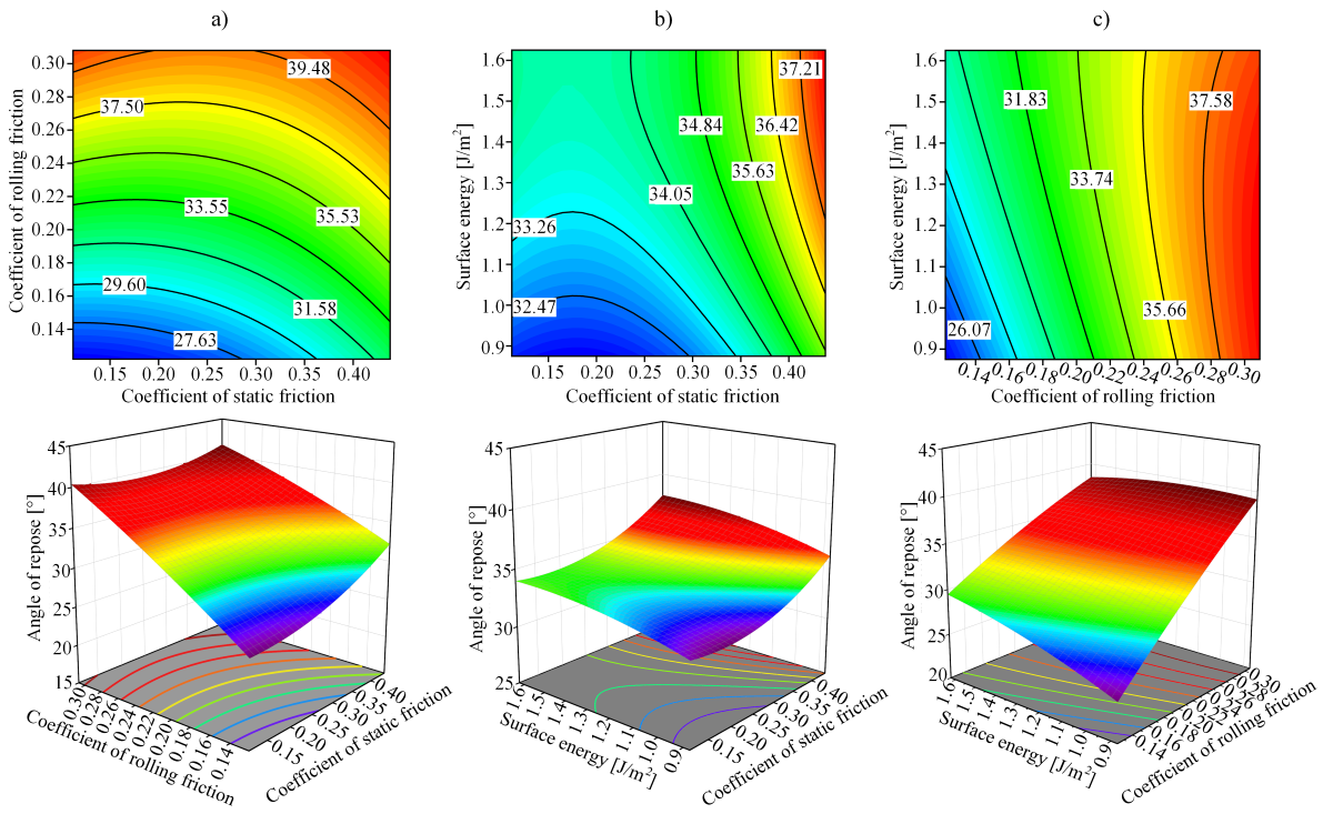 According to Table 6, a BB response surface experiment with 17 runs was designed for three factors at three levels. This experimental design was employed to explore the influence of variables on the repose angle, and to calibrate and optimize the sensitive coefficients (coefficient of static friction, coefficient of rolling friction, and surface energy). The detailed BB experimental design and results are shown in Table 7.