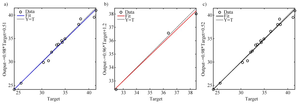 Figure 7 presents the relationship between the network output values and the objective functions of the training, test, and complete sets. The results indicate that the correlation coefficients R of all datasets exceed 0.95, with no overfitting phenomenon occurring, suggesting that the model’s good generalization performance.