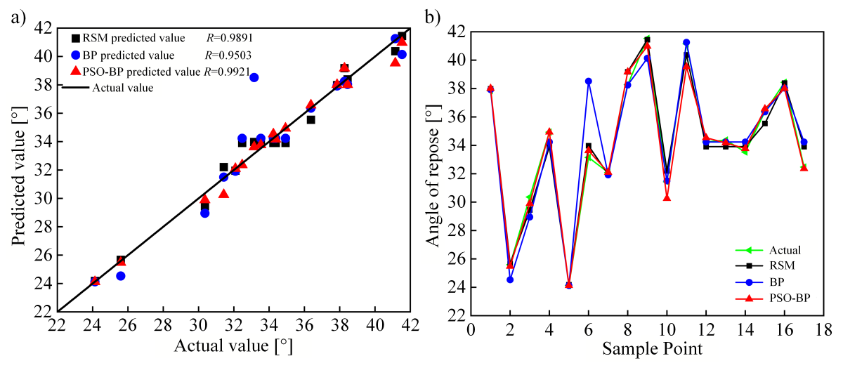 This study compares the prediction performance of RSM, BP and PSO-BP. The comparison graph between the predicted and actual values for each model is shown in Fig. 8a. The correlation coefficient R was calculated to evaluate the predictive accuracy of each model. The results show that the PSO-BP achieves the highest correlation cofficient, which is 0.9921, suggesting that the PSO-BPNN model outperforms the RSM and BPNN models in terms of prediction accuracy, stability and generalization capability. Fig. 8b represents the comparison curves of the fitting results obtained from the three models.